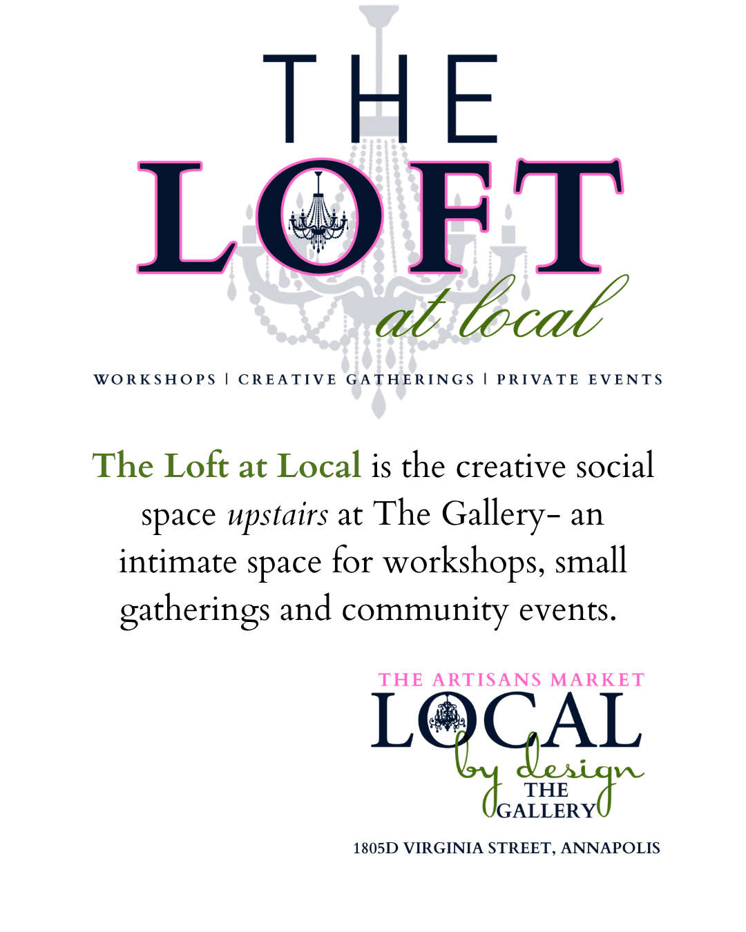 The Loft at Local by Design Annapolis is a versatile creative studio space perfect for art workshops, craft classes, and intimate gatherings. Ideal for craft enthusiasts, team building activities, and anyone wanting to explore their artistic side in Annapolis. Book your workshop or reserve the space for your next creative gathering today.